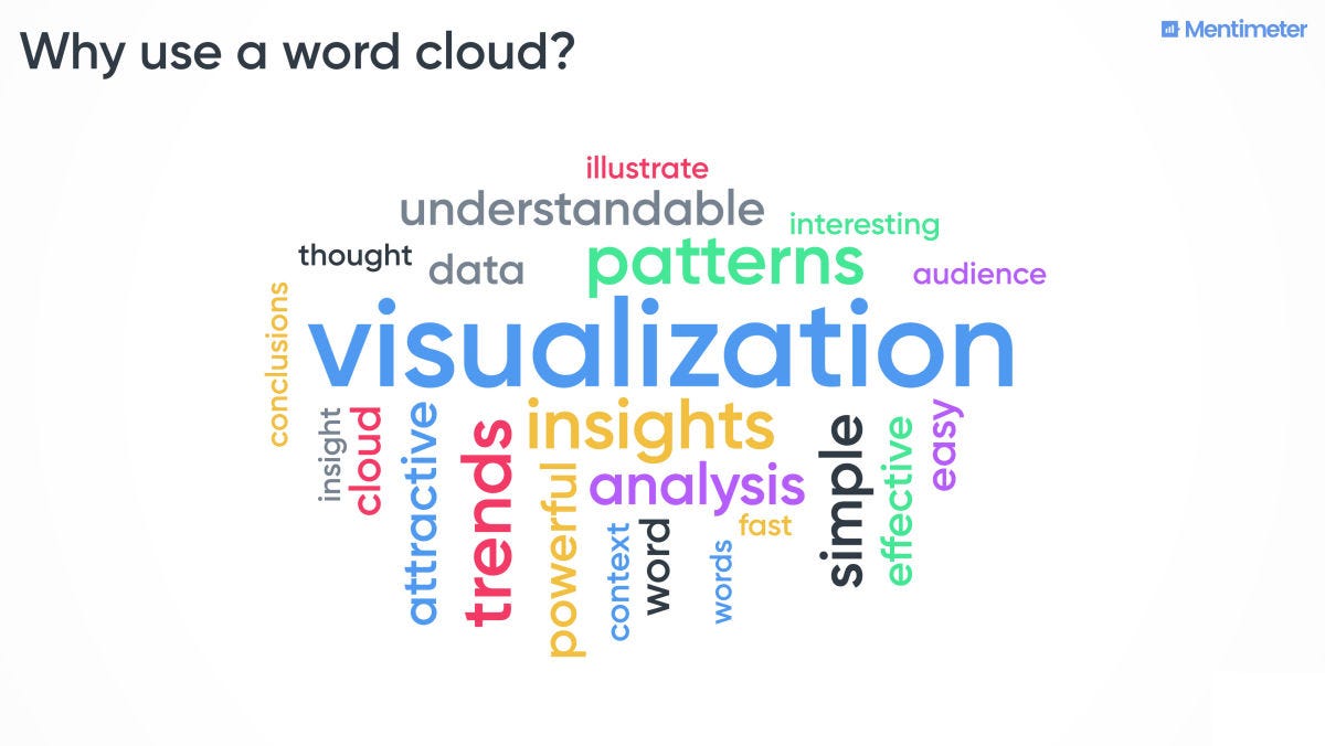 How to create a word cloud. Our free word cloud generator (up to 50 participants) lets your audience actively engage in your presentation. Use mentimeter's templates or your own questions. How to make a menti word cloud. Learn how to create a word cloud slide in mentimeter, a tool that displays your audience's answers in a visually stunning way.